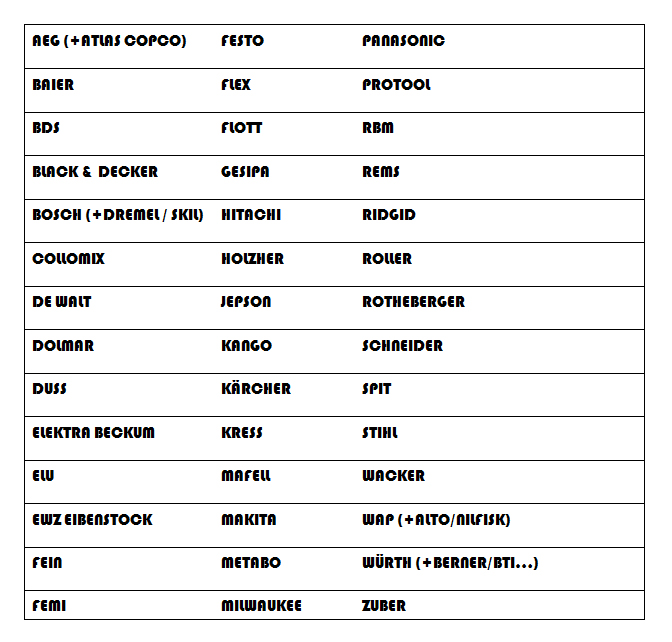 |  | | » Verkauf und Verleih | Verkauf & Verleih... Folgende Markengeräte können direkt durch uns erworben werden. Neben unserem Verkaufsangebot können wir Ihnen auch verschiedene Elektrowerkzeuge zum Verleih anbieten. Unser Verkaufsprogramm gilt beispielsweise für: